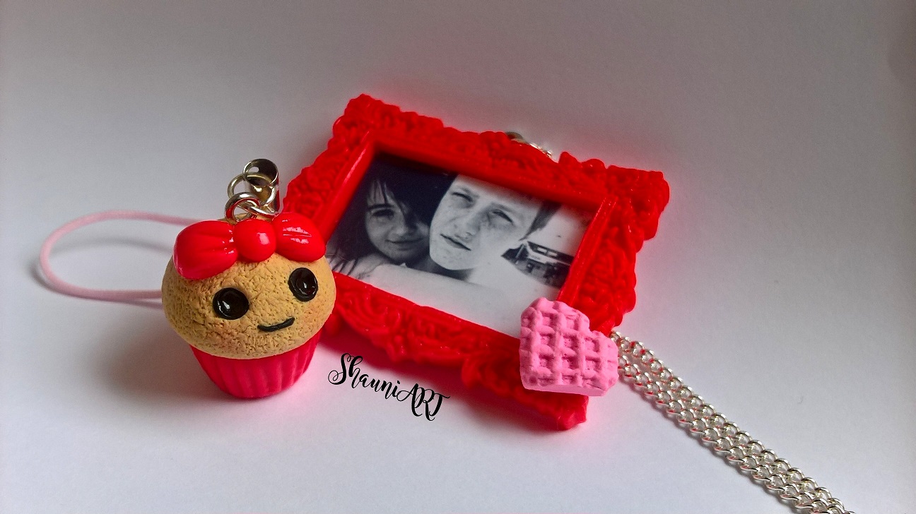 Z tej okazji wykonałam dla mamy prezent. Jest to zawieszka do komórki oraz naszyjnik ramka ze zdjęciem. Moja mama lubi kolor różowy, więc takie też kolory zastosowałam - fluorescencyjny róż z dodatkiem jasnego różu. W ramkę wkleiłam zdjęcie z bratem - uznałam, że to będzie wspólny prezent od nas. Mam nadzieję, że jej się spodoba. Przyznam, że to pomysł na szybko. :)